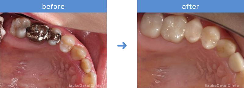 | 施術の説明 | 欠けたハイブリットセラミックを除去し、 セラミック素材(陶器)の被せ物をする治療法 |